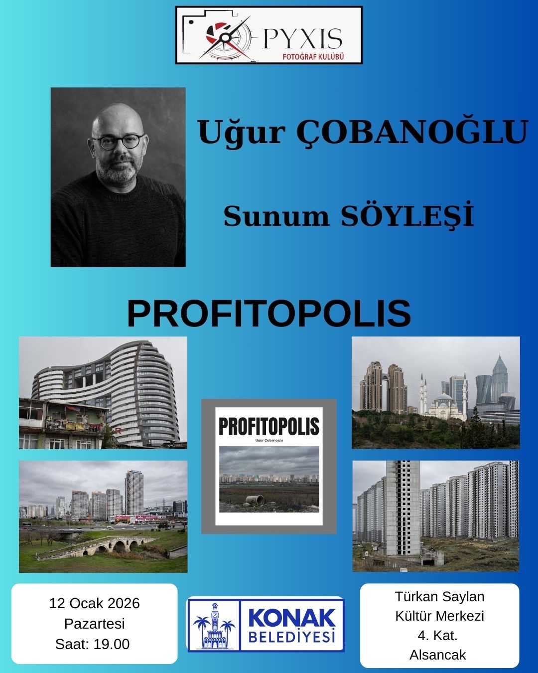 Pyxis Fotoğraf Kulübü'nün davetlisi olarak İzmir Türkan Saylan Kültür Merkezi'nde belgesel fotoğraf kitabım 'PROFITOPOLIS'in tanıtımı ve barkovizyon gösteriminin ardından "Kentleşme ve Kentleşmenin Yarattığı Travmalar" hakkında sunum ve söyleşi gerçekleştirdim.